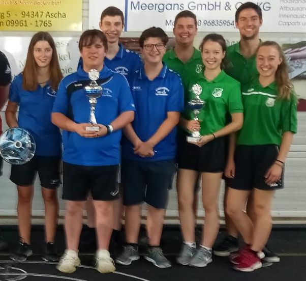 Mit 14:2 Punkten belegten sie hinter dem überragend aufspielenden TSV Niederviehbach, 14:0 Punkte, den zweiten Platz. Somit war das Ticket zur Deutschen Meisterschaft am 12. September in Kühbach bereits vorzeitig gelöst. Bei den entscheidenden Finalspielen ging es dann um den Titel und die Podestplätze. Im Halbfinale gegen den SV Windberg bewies das Quartett Nervenstärke und gewann nach Verlängerung im „Masten“ mit 32:28, wobei erst mit dem letzten Schuss Anna Hinteraicher mit einer Zehn den Sieg perfekt machte. Auch Michael Zanklmaier und Mathias Hahn sammelten mit einer Zehn die maximale Ausbeute. Nach sechs Kehren im regulären Halbfinale stand die Partie 8:8 Unentschieden. Auch im zweiten Halbfinale kämpfte mit dem DJK-SV Wittibreut eine heimische Mannschaft um die Medaillen. Die Schwestern Julia und Sandra Thalbauer, Alexander Wimmer und Markus Mühlstraßer hatten ebenfalls gegen den TSV Niederviehbach klar mit 0:34 das Nachsehen und mussten sich im Spiel um Rang drei dem SV Windberg mit 5:17 geschlagen geben. Auch der ESV Mitterskirchen hatte im Finale gegen den TSV Niederviehbach keine Chance und verlor klar mit 3:29. Trotzdem gab es Jubel beim ESV Mitterskirchen über die Bayerische Vizemeisterschaft, genauso beim DJK-SV Wittibreut über die Fahrkarte zur Deutschen Meisterschaft. Knapp verpasste dies der Nachwuchs des SC Reicheneibach, der durch ein 15:13 über den SC Oberroth den siebten Platz belegte im Feld der 16 Mannschaften. (hm)Fototext: Fahren zur Deutschen Meisterschaft: der ESV Mitterskirchen links und der DJK-SV Wittibreut. Von links- Anna Hinteraicher, Lorenz Zanklmaier, Mathias Hahn und Michael Zanklmaier, Markus Mühlstraßer, Sandra Thalbauer, Alexander Wimmer und Julia Thalbauer.