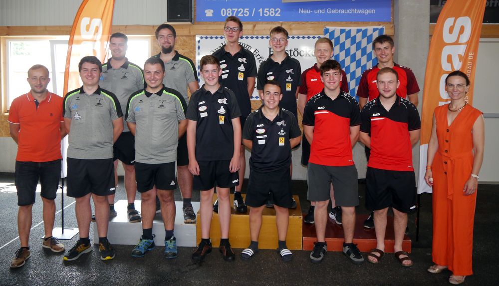 Nummer 215- Die drei besten U 14 Teams – von links Tanja Haas-Lensing, der ESV Mitterskirchen III mit Christina Eder, Emma Hahn und Verena Dallinger, der EC Prienbach mit Antonia Haderer, Julia Steininger und Quirin Brodschelm, der ESV Mitterskirchen II mit Markus Joachimbauer, Samuel Hahn und Daniel Rettenböck sowie Kreisjugendwart Michael Hinteraicher.