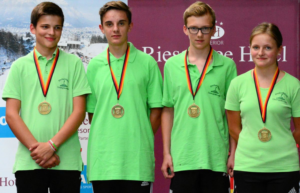 Zweimal Edelmetall und eine Reihe von guten, aber undankbaren Plätzen eroberten die Nachwuchsschützen bei den deutschen Meisterschaften in Kühbach. Herausragend dabei der 3. Platz im Mannschaftsspiel der U 16 durch den SSC Untergrasensee. Oskar Maier, Paul Wimmer, Thomas Hofbauer und Anna Lena Maier mussten dabei nur den überragend aufspielenden Teams des EEC Gotteszell und dem TSV Hartpenning (jeweils 11:3 Punkte) den Vortritt lassen. Beim Kampf um das letzte Edelmetall bewies das Quartett Nervenstärke und behauptete sich dank der besseren Stocknote von 1,22 gegenüber dem EC Oberhausen (0,77) und dem RSV Büblingshausen (0,74) auf dem dritten Rang bei jeweils 7:7 Punkten.
