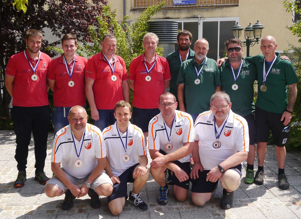Spielen in der nächsten Saison in d er Bezirksliga- hinten von links: der ESC Obertrennbach mit Stefan Wagner, Stefan Vilsmaier sowie Stefan und Josef Schnellberger der RSC Diepoltskirchen mit Martin Hochholzer, Hubert Kohlmeier, Andreas Aigner und Christian Sterzer sowie vorne der SV Hebertsfelden mit Hans Laxhuber, Roland Herburger, Michael Balk und Siegfried Krause |